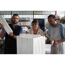 Per la realizzazione dei vasi, si è partiti da un modello di una delle facce in mdf con bassorilievo fresato, servito per la realizzazione di uno stampo in silicone, che è stato successivamente utilizzato per creare tutte le quattro facciate in gesso,assemblate a mano per creare il modello. Tale modello è servito per la realizzazione dello stampo, sempre in gesso, all’interno del quale, utilizzando barbottina da colaggio, sono stati prodotti i sedici vasi. I coperchi sono stati realizzati con la stessa tecnica di colaggio, costruendo un modello e uno stampo di gesso.